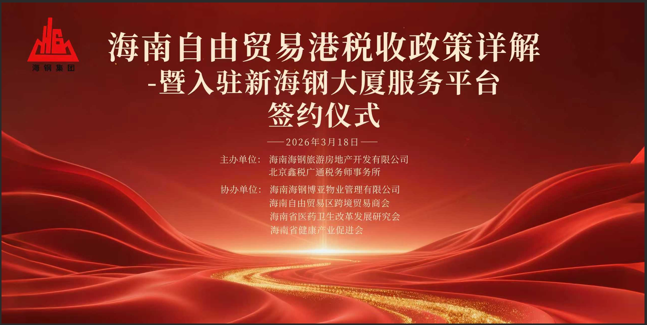 2026年3月18日下午,由海南海钢旅游房地产开发有限公司与北京鑫税广通税务师事务所联合主办的“海南自由贸易港税收政策详解暨入驻新海钢大厦服务平台签约仪式”在海口市新海钢大厦隆重举行。此次活动由海南海钢博亚物业管理有限公司、海南自由贸易区跨境贸易商会、海南省医药卫生改革发展研究会以及海南省健康产业促进会联合协办。我公司董事长王进以及咨询部项目经理王拴拴一行应邀参加。来自全市各地的企业代表、行业精英及专家学者齐聚一堂,共同探讨自贸港背景下的政策红利与发展机遇。