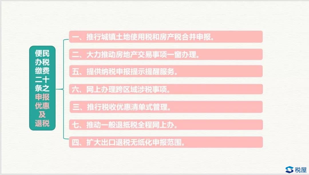 房土合并申报、房地产交易一窗办理、申报提醒、一般退抵税和跨区域事项网上办、优惠清单式管理、出口退税无纸化扩大。