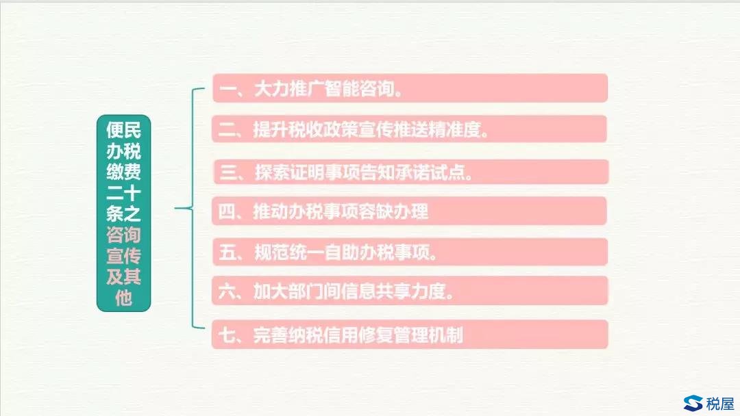 智能咨询、精准宣传、容缺办理、证明告知承诺、规范自助办税、信息共享、信用修复。