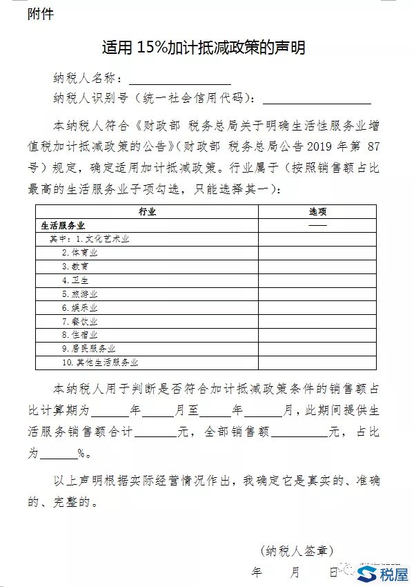 为帮助纳税人准确适用加计抵减政策,国家税务总局最新发布的《关于增值税发票管理等有关事项的公告》(国家税务总局公告2019年第33号,以下简称“33号公告”)明确,对于符合87号公告规定,申请享受“加计抵减15%政策”的生活性服务业纳税人,需要在年度首次确认适用15%加计抵减政策时,通过电子税务局(或前往办税服务厅)提交《适用15%加计抵减政策的声明》。