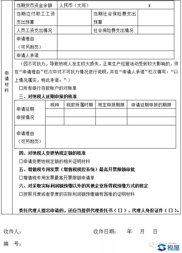 注:1.税务机关办理对纳税人延期申报的核准,不再要求申请人单独提供确有困难不能正常申报的情况说明,改为申请人在《税务行政许可申请表》中填写申请理由。