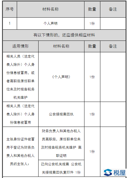 1.主张身份证件被冒用于登记为法定代表人、财务负责人和其他办税人员的: