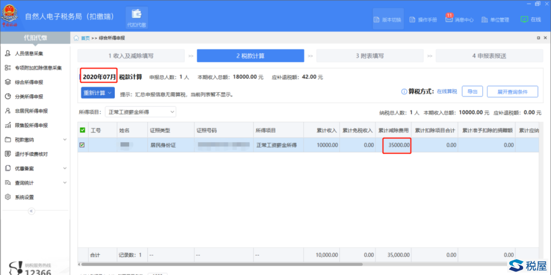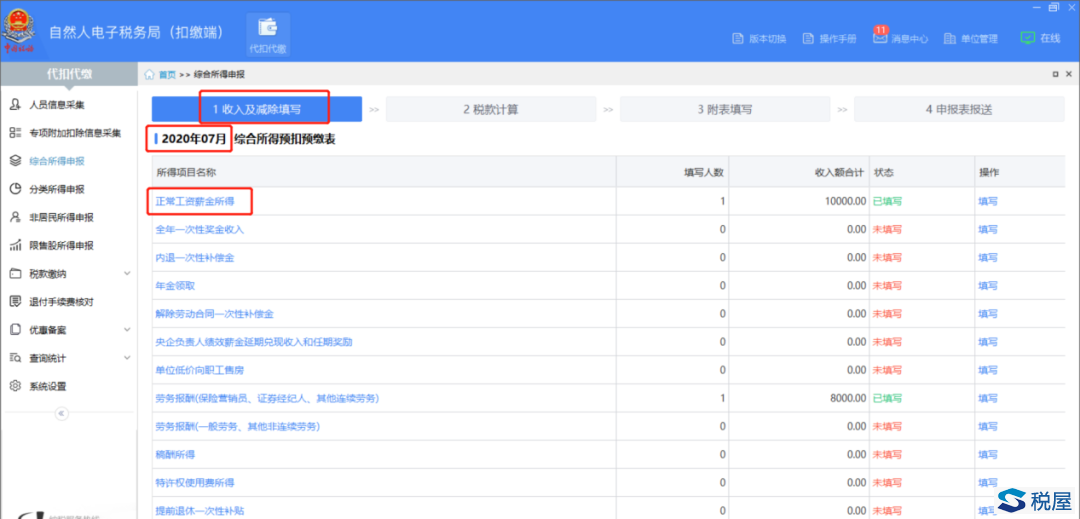 扣缴单位按照“正常工薪所得”填报收入及减除项目。税款计算环节时,系统将自动按照1月至当前月份的累计月份数计算累计减除费用(本年新成立的单位,从成立月份起计算)
