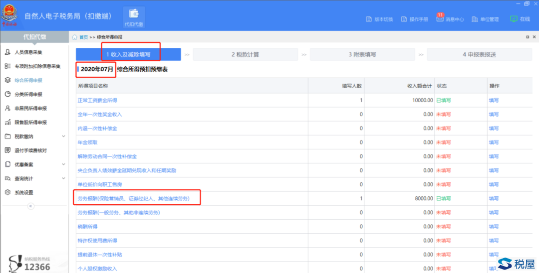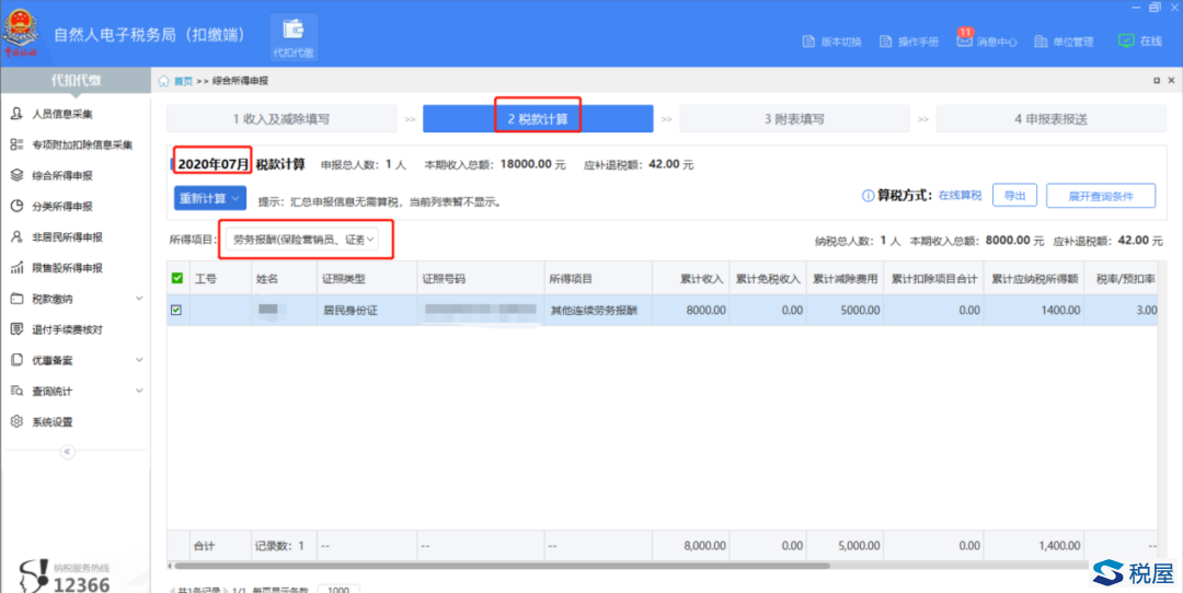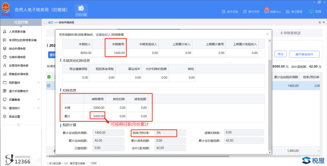 扣缴单位按照“劳务报酬(保险营销员、证券经纪人、其他连续劳务)”填报收入及减除项目。税款计算环节时,系统将自动按照任职月份数(入职时间到当前月份数)×5000元/月,计算累计减除费用,并按照累计预扣法计算并预扣预缴税款。