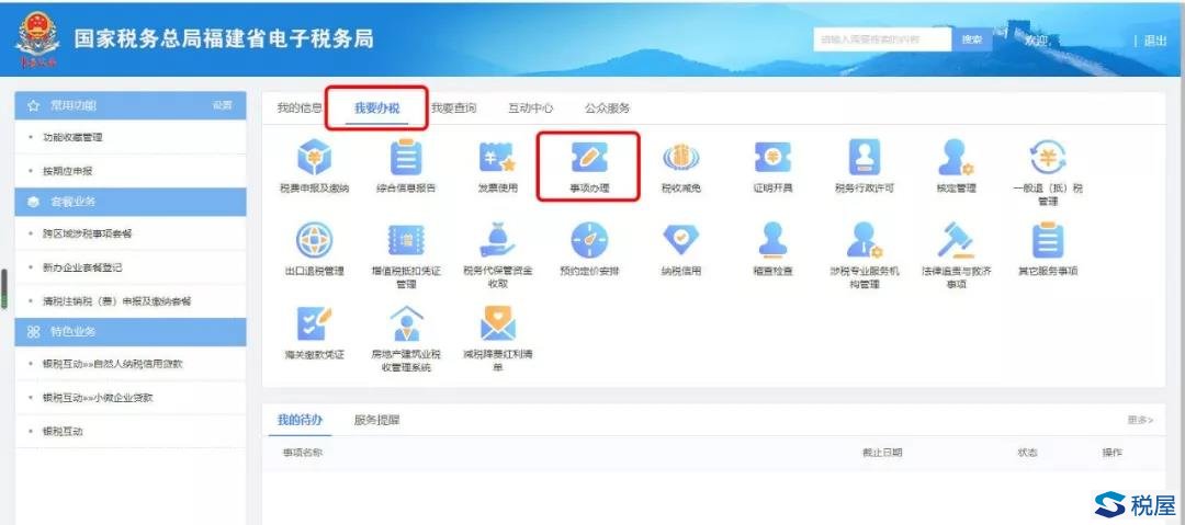 第二步:登录后,点击“我要办税”,再选择“事项办理”。