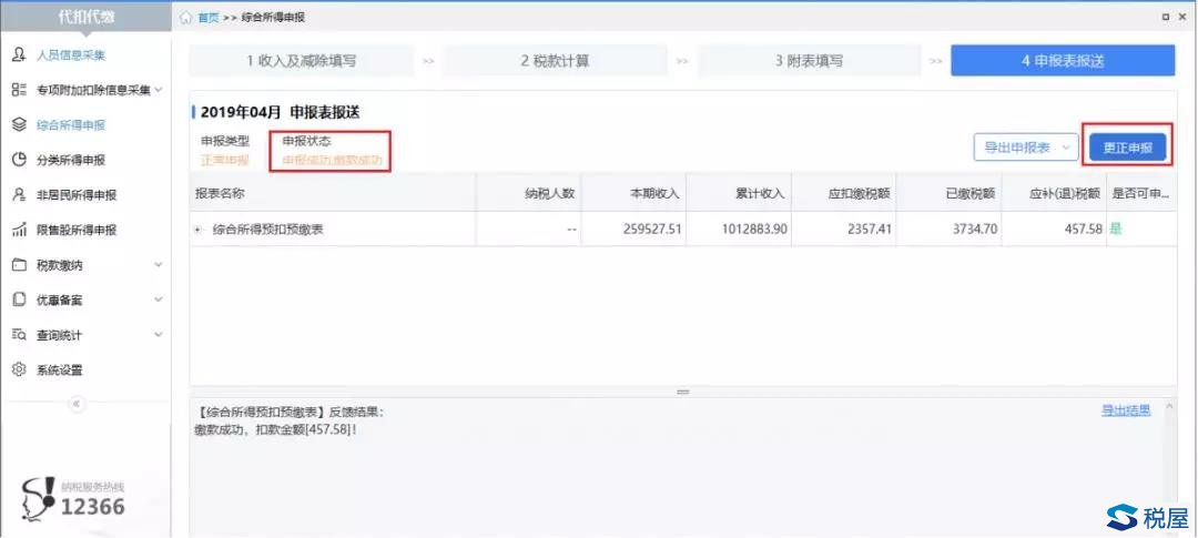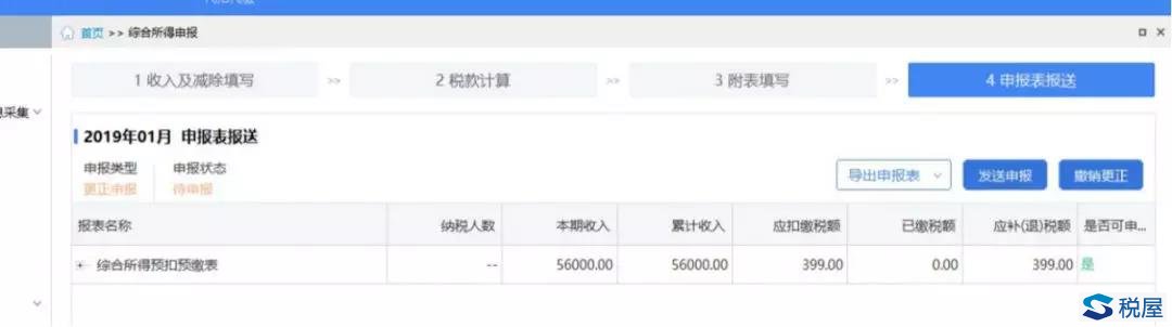 ②点击【综合所得申报】进入综合所得申报界面,点击【4申报表报送】查看当前月份申报状态,只有申报状态为“申报成功”的情况下才允许启动更正申报。