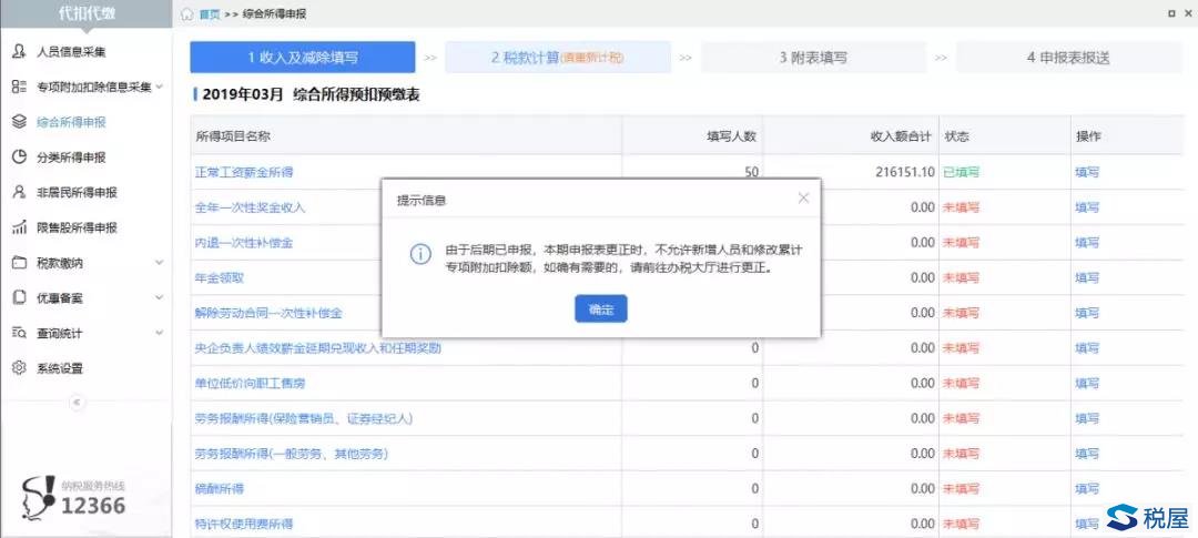 ①点击【1收入及减除填写】,系统将弹出提示,往期错误更正时,不能新增人员和修改累计专项附加扣除额,点击确定后,继续选择需要修改的所得项目。