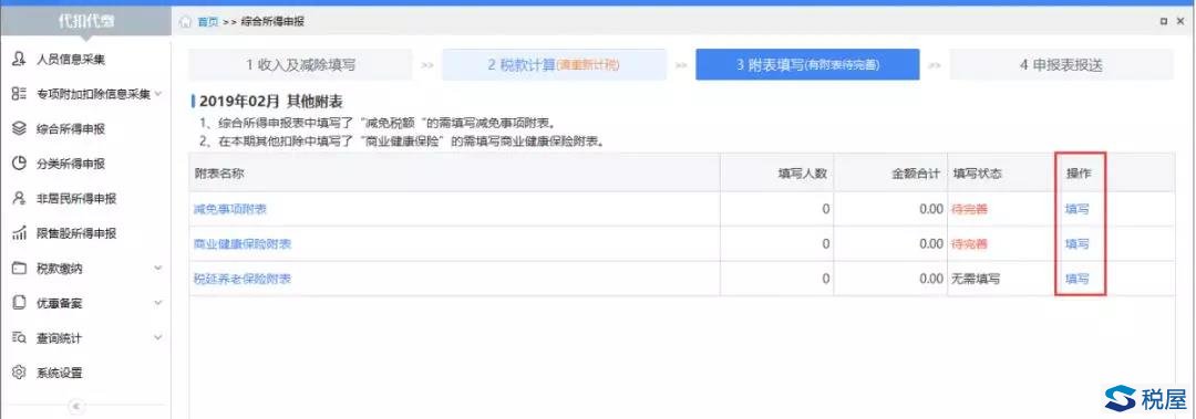 【1收入及减除填写】中如果填写了“减免税额”、“商业健康保险”或“税延养老保险”,需要在【3附表填写】中完善附表信息。