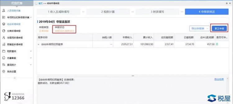②点击【综合所得申报】进入综合所得申报界面,点击【4申报表报送】查看当前月份申报状态,只有申报状态为“申报成功”的情况下才允许启动更正申报。