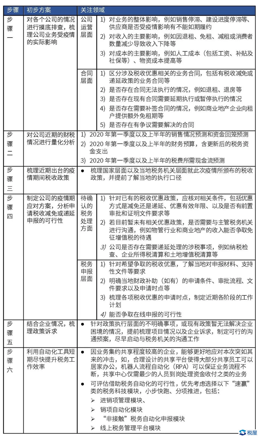 此次疫情爆发的影响会持续一段时间,给各个企业的影响大小不同,从短期而言,我们建议企业考虑结合以下步骤,从梳理实际情况出发,结合疫情对各自的影响,制定相关应对方案。