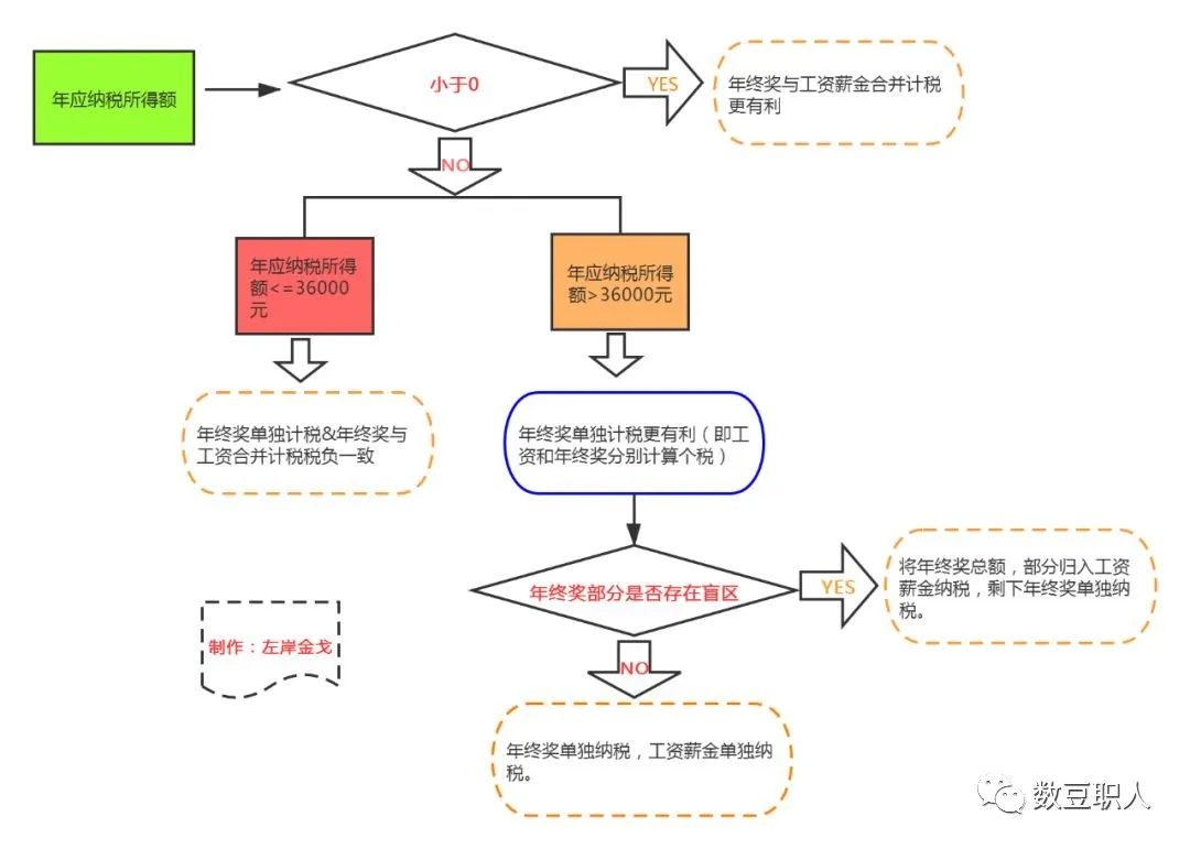4:年应纳税所得额>36000元,年终奖单独计税更有利(即工资和年终奖分别计算个税),但是需要看年终奖部分是否存在盲区,如果存在盲区,则将年终奖总额,部分归入工资薪金纳税,剩下年终奖单独纳税。具体怎么测算,本文第三部分有详细案例介绍。