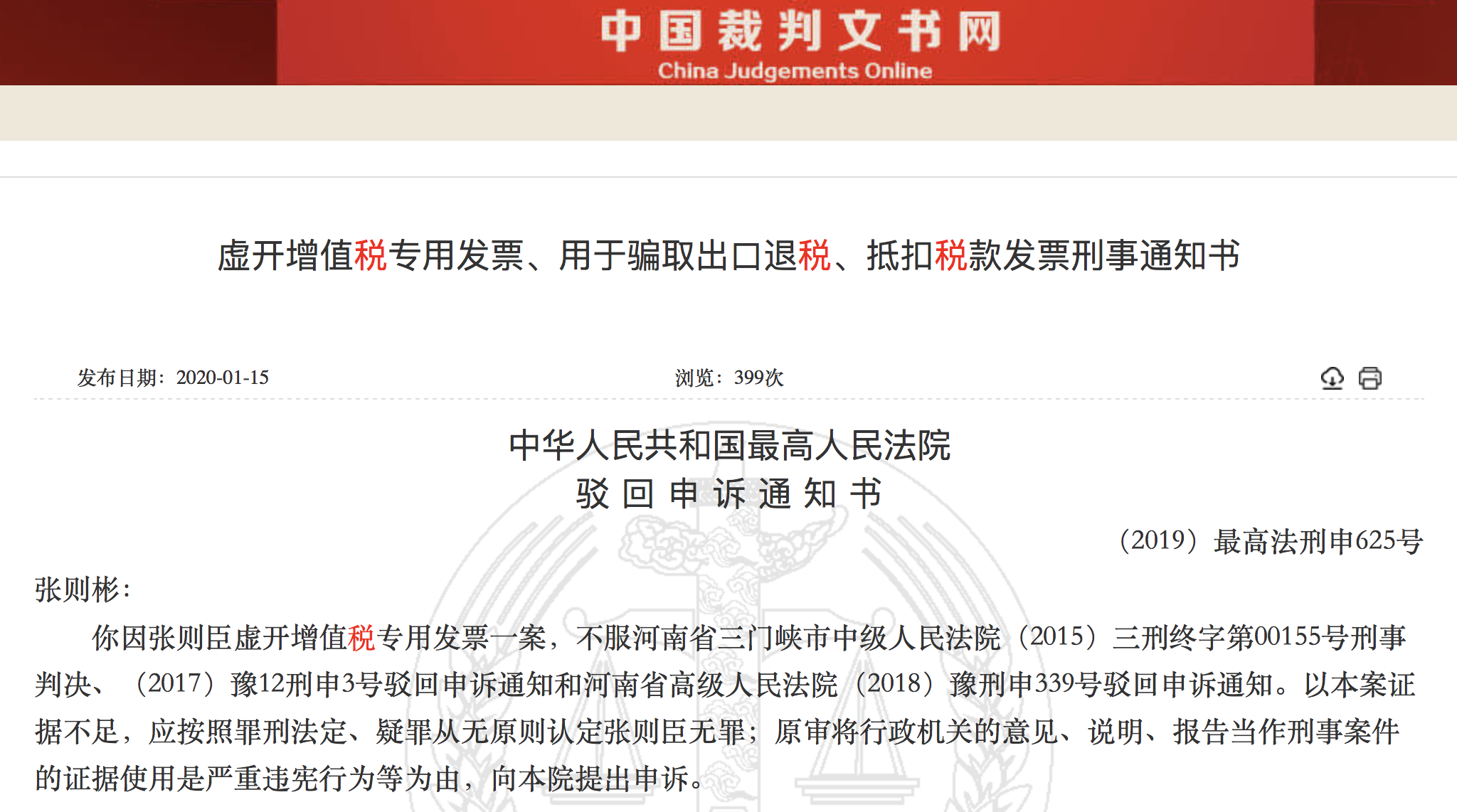 你因张则臣虚开增值税专用发票一案,不服河南省三门峡市中级人民法院(2015)三刑终字第00155号刑事判决、(2017)豫12刑申3号驳回申诉通知和河南省高级人民法院(2018)豫刑申339号驳回申诉通知。以本案证据不足,应按照罪刑法定、疑罪从无原则认定张则臣无罪;原审将行政机关的意见、说明、报告当作刑事案件的证据使用是严重违宪行为等为由,向本院提出申诉。