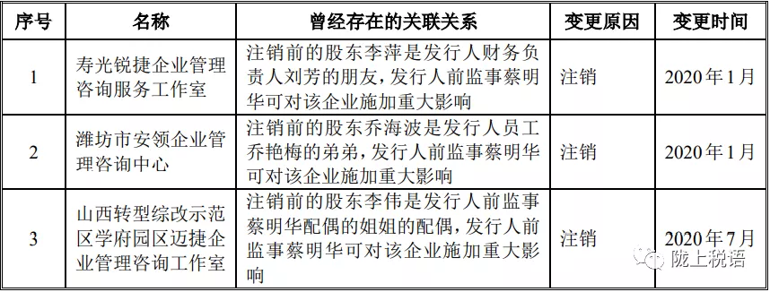 2018年6月至2019年9月期间,发行人子公司江苏慧博以咨询顾问采购形式,向寿光锐捷企业管理咨询服务工作室、潍坊市安领企业管理咨询中心、山西转型综改示范区学府园区迈捷企业管理咨询工作室(以下简称“3家个人独资企业”)支付了422.53万元咨询服务费,该等费用中,379.17万元最终实际支付给公司的17名员工作为其薪酬的一部分。上述3家个人独资企业均已注销,为发行人报告期内曾经的关联方,具体如下: