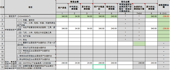 由于选择一次性税前折旧扣除政策,其中:设备(甲)税法折旧0万元,会计折旧10万元,纳税调增10万元,设备(乙)税法折旧240万元,会计折旧24万元,纳税调减216万元,合计纳税调减206万元,因此在所得税汇算清缴时A105080《资产折旧、摊销及纳税调整明细表》填列如下: