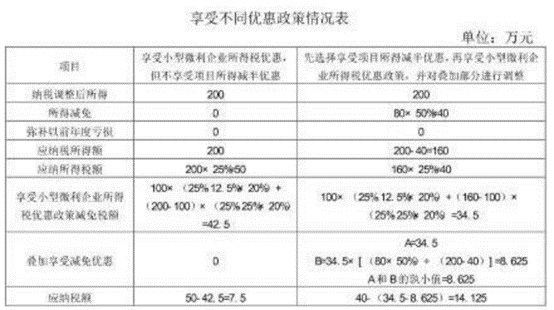 根据13 号公告等文件,目前小型微利企业年度应纳税所得额不超过100 万元的部分,实际税负为2.5% ;应纳税所得额超过100 万元但不超过300 万元的部分,实际税负为5%,政策力度较大。当企业同时符合两项以上税收优惠时,可以根据实际情况选择适用。比如,当小型微利企业同时具有高新技术企业资质可享受高新技术企业所得税低税率优惠的,因小型微利企业所得税优惠力度更大,企业可选择享受小型微利企业所得税优惠,而不享受高新技术企业优惠政策。又如,当小型微利企业同时符合农林牧渔项目和环境保护、节能节水项目等项目所得减半征收企业所得税优惠政策条件时,因所得减半优惠是按照法定税率25% 计算减半,企业可以根据自身实际情况选择同时适用两类税收优惠,或者选择放弃适用项目所得减半优惠政策,以享受最大优惠力度。如果企业选择同时适用小型微利企业所得税优惠与项目所得减半优惠,对于按优惠税率减半叠加享受减免税优惠部分,需进行调整。根据税务总局发布的《国家税务总局关于企业所得税年度汇算清缴有关事项的公告》(国家税务总局公告2021 年第34 号)中的计算公式,即A= 需要进行叠加调整的减免所得税优惠金额;B=A×[(减半项目所得×50%)÷(纳税调整后所得-所得减免)] ;叠加享受减免税优惠金额=A和B 的孰小值,举例如下: