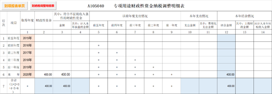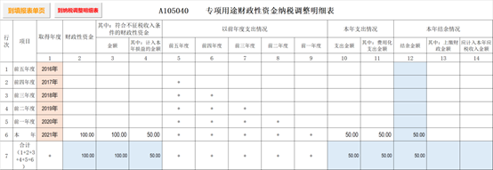 收到100万财政性资金填入A105040表中,计入损益金额为本年发生支出的金额,费用化金额为50万。(为便于列示图示金额单位均为:万元)