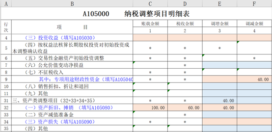 会计核算确认“累计折旧”金额100万元,其中不征税收入用于支出所形成的资产计算的折旧金额40万元,不得税前扣除,应纳税调增。