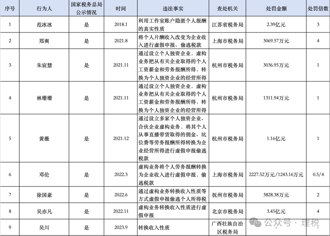 据公开查找的案例来看,首次出现“转换收入性质”定性是在国家税务总局通报的范冰冰偷税一案中,在该税案中,范冰冰利用工作室账户隐匿个人报酬的真实性质,偷逃税款约8000万元,最终被处以偷逃税款的3倍罚款计2.39亿元。