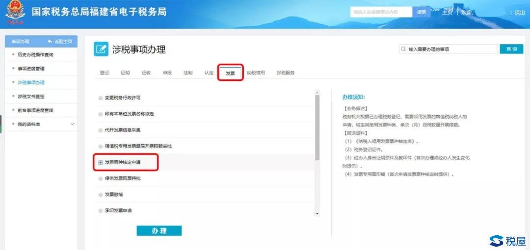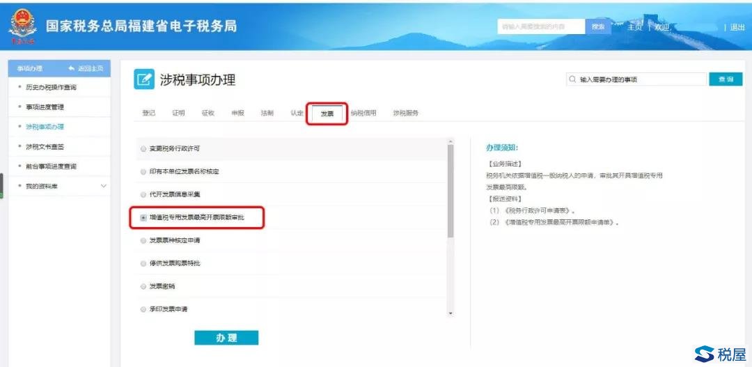 第五步:待审核通过后,返回“涉税事项办理”,依旧选择“发票”,再点击“增值税专用发票最高开票限额审批”。