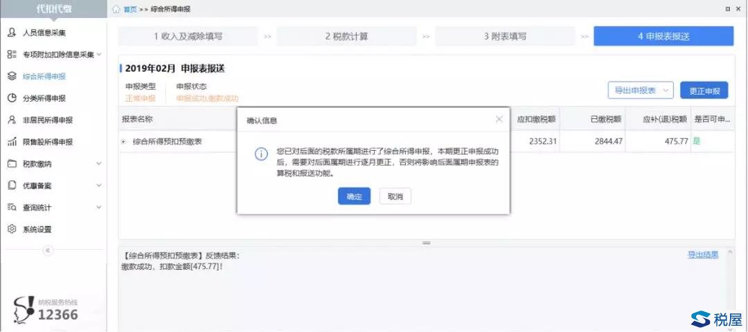 ③点击【更正申报】按钮,启动更正申报,系统提示往期错误更正申报成功后,需要对后续税款所属期的综合所得预扣预缴申报表进行逐月更正。