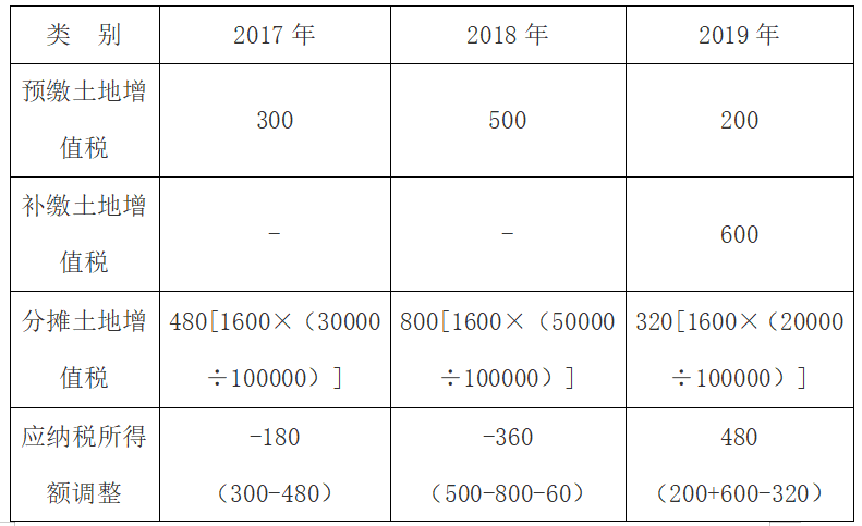 上述两个公告的计算口径一致,即房地产开发企业开发项目缴纳的土地增值税总额,应按照该项目开发各年度实现的项目销售收入占整个项目销售收入总额的比例,在项目开发各年度进行分摊,并计算各年度及累计应退的税款。现举例如下: