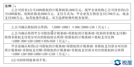 公式二:资产取得方取得资产(股权)的计税基础=原资产(股权)的计税基础-非股权支付部分对应的原计税基础+非股权支付额=原资产(股权)的计税基础+非股权支付部分对应的转让所得