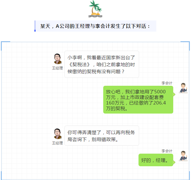 因此,A公司应缴纳的契税计税依据应为土地出让金5000万元、市政建设配套费160万元、拆迁补偿款1000万元、安置补助费400万元、补缴的土地出让金1000万元、由此增加的市政建设配套费32万元。
