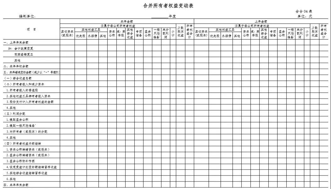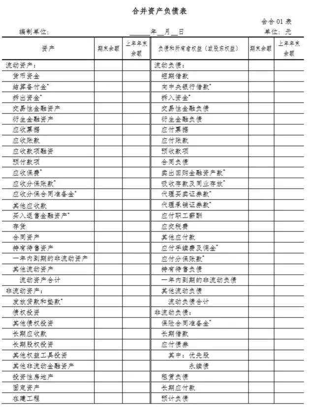 提示:财会〔2019〕16号文件规定了合并财务报表格式涵盖母公司和从事各类经济业务的子公司的情况,包括一般企业、商业银行、保险公司和证券公司等。企业应根据重要性原则并结合本企业实际情况,对确需单独列示的内容,可增加合并财务报表项目;对不存在相应业务的合并财务报表项目,可进行必要删减。以金融企业为主的企业集团,应以金融企业财务报表格式为基础,结合一般企业财务报表格式和本通知的要求,对合并财务报表项目进行调整后编制。