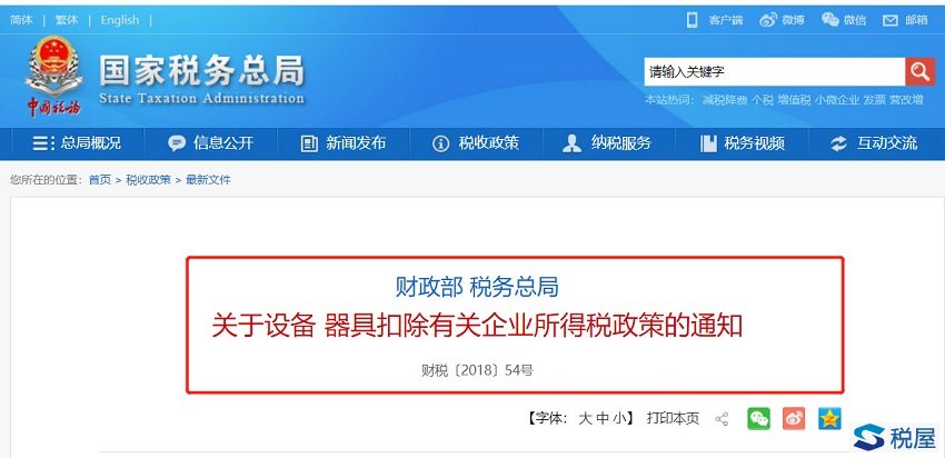 1.财税〔2018〕54号规定:企业在2018年1月1日至2020年12月31日期间新购进的设备、器具(指除房屋、建筑物以外的固定资产),单位价值不超过500万元的,允许一次性计入当期成本费用在计算应纳税所得额时扣除,不再分年度计算折旧。