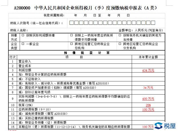 因此第一季度预缴企业所得税=(434-34万元)*25%=100万元