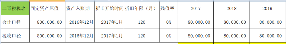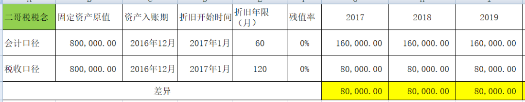 二哥税税念2016年12月购进一台价值80万的机器设备,不考虑残值,会计按10进行折旧,税法上机器设备最低折旧年限也是10年。