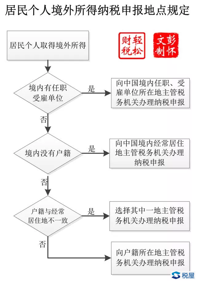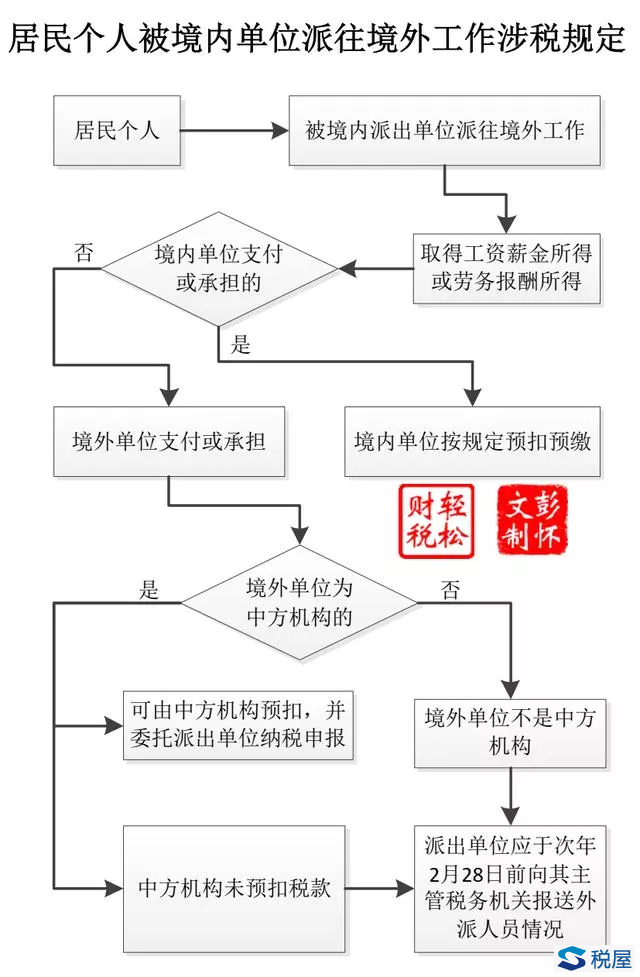 另外,《国家税务总局关于境外所得征收个人所得税若干问题的通知》(国税发[1994]44号)文目前仍然有效,其中第一条规定:纳税人来源于中国境外的应税所得,在境外以纳税年度计算缴纳个人所得税的,应在所得来源国的纳税年度终了、结清税款后的30日内,向中国税务机关申报缴纳个人所得税;在取得境外所得时结算税款的,或者在境外按来源国税法规定免予缴纳个人所得税的,应在次年1月1日起30日内向中国税务机关申报缴纳个人所得税。纳税人兼有来源于中国境内、境外所得的,应分别申报计算纳税。(税屋提示——国税发[1994]44号已被财政部 税务总局公告2020年第3号 关于境外所得有关个人所得税政策的公告废止。) 根据法律层次以及"新法优于旧法"的原则,在纳税申报期限上首先应考虑适用修订后的个税法第十三条规定,即次年三月一日至六月三十日内申报纳税。之所以会出台国税发[1994]44号对纳税期限的补充规定,主要是原来个税法对境外所得纳税申报期限要求的是"年度终了后30日内",与世界上部分国家执行的财年时间不吻合,导致境外以纳税年度计算缴纳个人所得税的尚未结清税款。而新修订后的规定,将境外所得申报期限与综合所得汇算清缴时间一致,也就基本上消除了境外按年度计税尚未结清税款的情况,同时也方便纳税人汇算清缴。 十、代扣代缴境外所得的预扣预缴与自行申报 (一)境外所得的预扣预缴 1.代扣代缴 财税公告2020年第3号第十一条规定: 居民个人被境内企业、单位、其他组织(以下称派出单位)派往境外工作,取得的工资薪金所得或者劳务报酬所得,由派出单位或者其他境内单位支付或负担的,派出单位或者其他境内单位应按照个人所得税法及其实施条例规定预扣预缴税款。 居民个人被派出单位派往境外工作,取得的工资薪金所得或者劳务报酬所得,由境外单位支付或负担的,如果境外单位为境外任职、受雇的中方机构(以下称中方机构)的,可以由境外任职、受雇的中方机构预扣税款,并委托派出单位向主管税务机关申报纳税。中方机构未预扣税款的或者境外单位不是中方机构的,派出单位应当于次年2月28日前向其主管税务机关报送外派人员情况,包括:外派人员的姓名、身份证件类型及身份证件号码、职务、派往国家和地区、境外工作单位名称和地址、派遣期限、境内外收入及缴税情况等。 中方机构包括中国境内企业、事业单位、其他经济组织以及国家机关所属的境外分支机构、子公司、使(领)馆、代表处等。 对上述规定,通过流程图来捋顺一下思路:如图-4