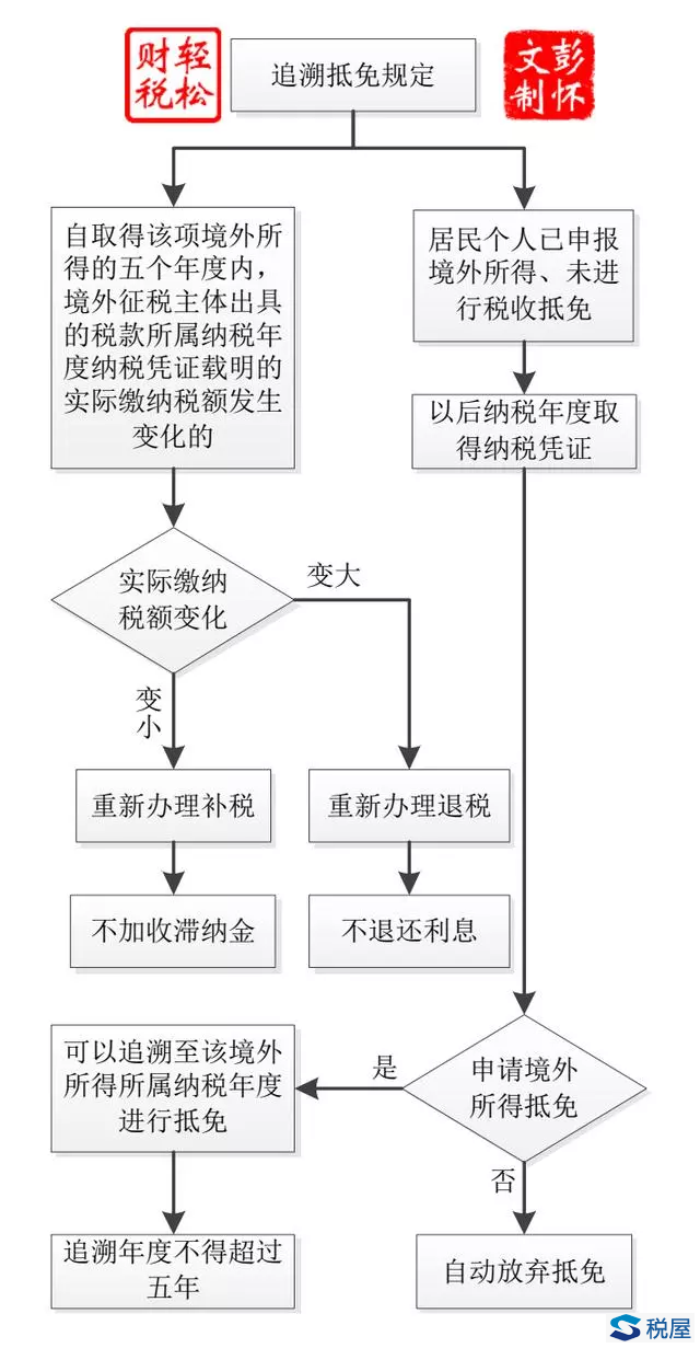 八、境内境外纳税年度不一致的处理办法 财税公告2020年第3号第九条规定,居民个人取得境外所得的境外纳税年度与公历年度不一致的,取得境外所得的境外纳税年度最后一日所在的公历年度,为境外所得对应的我国纳税年度。 我国《个人所得税法》第一条规定,纳税年度,自公历一月一日起至十二月三十一日止。 境外国家或地区,有可能纳税年度与我国不一致。 例如B国的纳税年度是从上年的4月1日到次年的3月31日,居民个人张某2019年5月至12月期间在该国取得境外所得,按其境外纳税年度计算最后一日是2020年3月31日,对应的公历年度是2020年度。 因此,虽然张某是公历2019年度取得的境外所得,但是纳税年度按上述规定要算为2020年度。 九、抵免凭证的要求与追溯抵免规定 (一)抵免凭证的要求 《个人所得税法实施条例》第二十二条规定,居民个人申请抵免已在境外缴纳的个人所得税税额,应当提供境外税务机关出具的税款所属年度的有关纳税凭证。 财税公告2020年第3号第十条规定,居民个人申报境外所得税收抵免时,除另有规定外,应当提供境外征税主体出具的税款所属年度的完税证明、税收缴款书或者纳税记录等纳税凭证,未提供符合要求的纳税凭证,不予抵免。纳税人确实无法提供纳税凭证的,可同时凭境外所得纳税申报表(或者境外征税主体确认的缴税通知书)以及对应的银行缴款凭证办理境外所得抵免事宜。 与原个人所得税法实施条例第三十四条相比,删除了原件要求,也就是复印件在一定情况下也可行,更加切合实际了。 (二)追溯抵免规定 财税公告2020年第3号第十条规定,居民个人已申报境外所得、未进行税收抵免,在以后纳税年度取得纳税凭证并申报境外所得税收抵免的,可以追溯至该境外所得所属纳税年度进行抵免,但追溯年度不得超过五年。自取得该项境外所得的五个年度内,境外征税主体出具的税款所属纳税年度纳税凭证载明的实际缴纳税额发生变化的,按实际缴纳税额重新计算并办理补退税,不加收税收滞纳金,不退还利息。 对上述规定,归纳总结如下:图-3