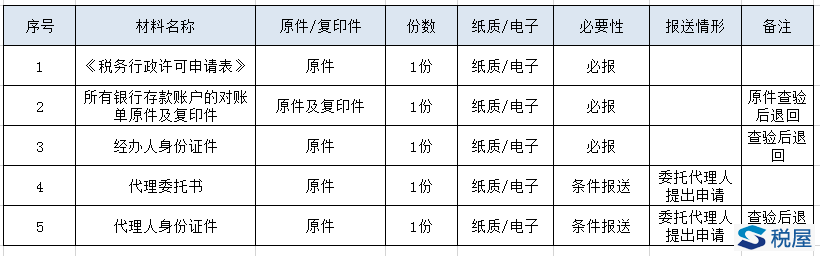 6.税务行政许可实施机关与申请人不在同一县(市、区、旗)的,申请人可在规定的申请期限内,选择由其主管税务机关代为转报申请材料。主管税务机关在核对申请材料后向申请人出具材料接收清单,并向税务行政许可实施机关转报。代办转报一般应当在5个工作日内完成。