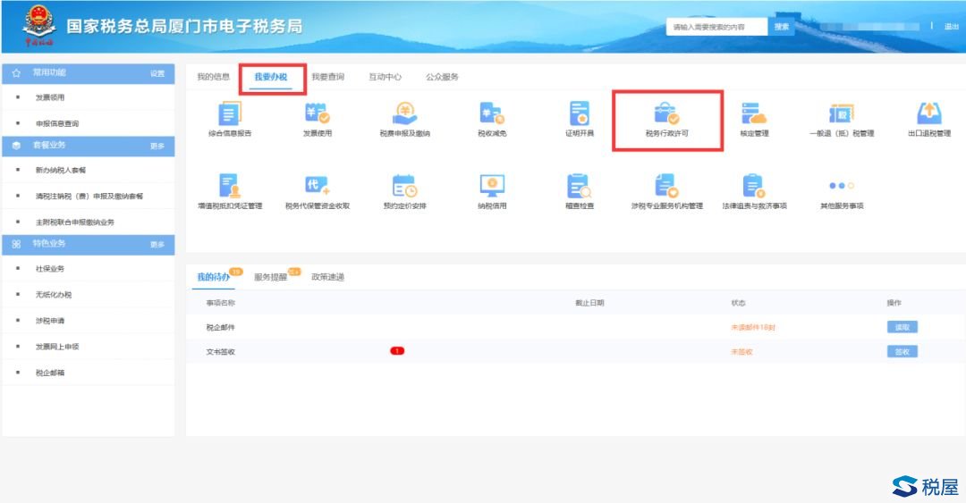 1.登录各省市电子税务局,进入系统后,选择“我要办税”——点击“税务行政许可”