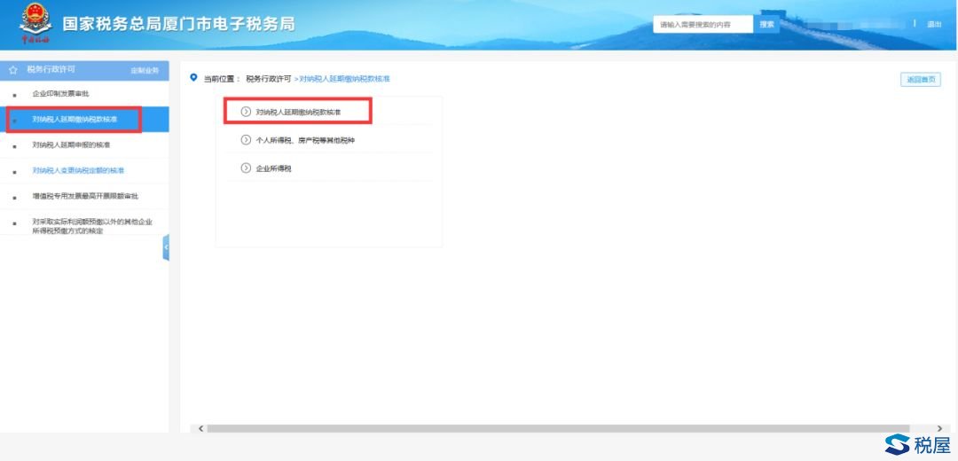 2.点击“对纳税人延期缴纳税款核准”项目——选中的“对纳税人延期缴纳税款核准”选项。