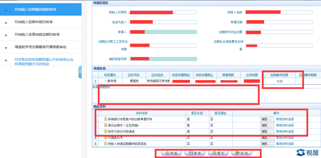 3.在表格中填写“延期缴纳的税额”——“申请延期理由”——上传相关材料,并点击“校验”—“保存”—“提交”。