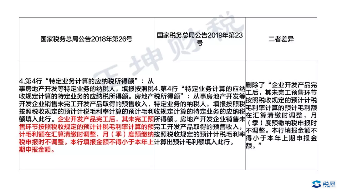 国家税务总局于2019年6月14日发布了《国家税务总局关于修订2018年版企业所得税预缴纳税申报表部分表单及填报说明的公告》(国家税务总局公告2019年第23号),该公告对2018年版房地产企业所得税预缴纳税申报表作出了修订,变化前后如下表: