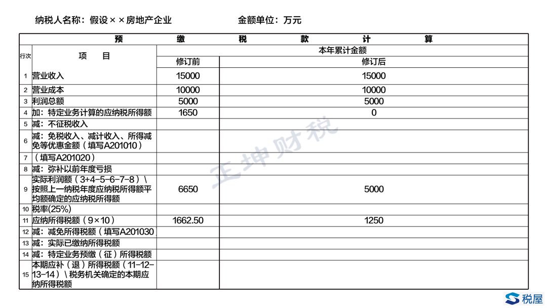 综上,房地产企业所得税预缴申报表修订之前三季度累计应纳所得税额比房地产企业所得税预缴申报表修订之后三季度累计应纳所得税额多预缴412.50万元(1662.50-1250=412.50万元),同时可清晰看到企业所得税预缴申报表修订之后“特定业务计算的应纳税所得额”三季度填报金额比二季度申报金额小。