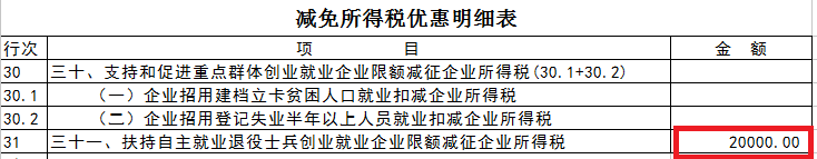 保存退出后点击“生成报表”,“A107040 减免所得税优惠明细表”第31行“扶持自主就业退役士兵创业就业限额扣减征企业所得税”就会自动生成享受优惠金额2万元。