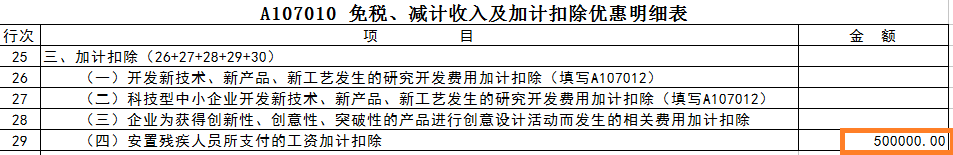 保存退出后点击“生成报表”,“A107010 免税、减计收入及加计扣除优惠明细表”第29行“安置残疾人员所支付的工资加计扣除”就会自动生成享受优惠金额50万元。