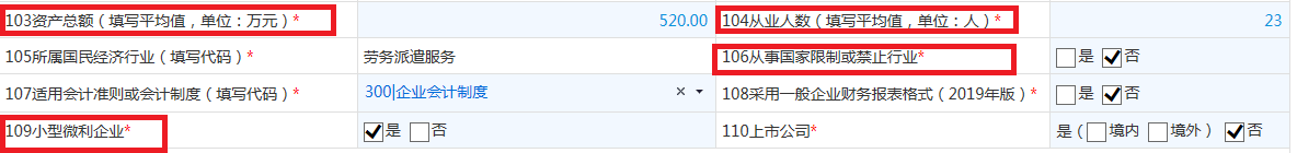 注意:填写“资产总额”(单位:万元)、“从业人数”、“从事国家限制或禁止行业”选“否”、“小型微利企业”选“是”。