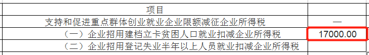 在“优惠类”-“企业招用建档立卡贫困人口就业扣减企业所得税”项目填入应享受金额1.7万元。