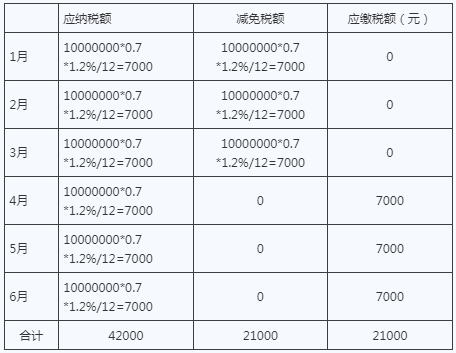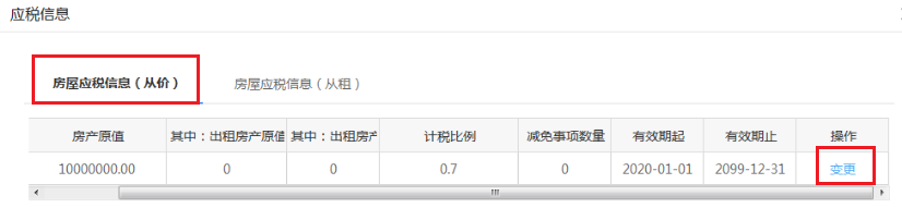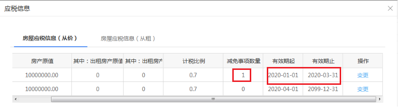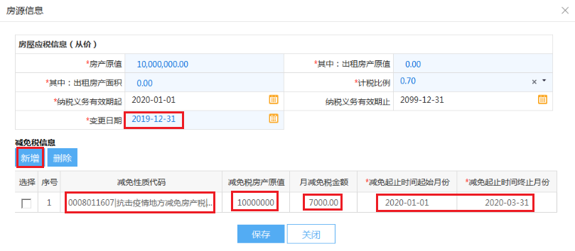先选择房屋应税信息(从价),点击应税明细条目后“变更”,点击“减免税信息”中的“新增”,选择对应减免性质“抗击疫情地方减免房产税”,填写减免税房产原值10000000,月减免税金额7000,减免起止月份为1-3月。然后,填写“变更时间”,为“减免起止时间起始月份”前一个月月末最后一日即2019年12月31日。(即减免月份1-3月,减免税额21000元,月减免税额7000元)