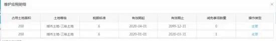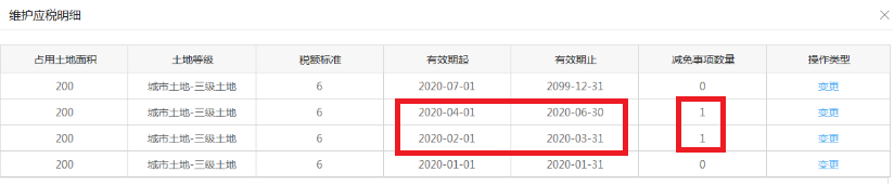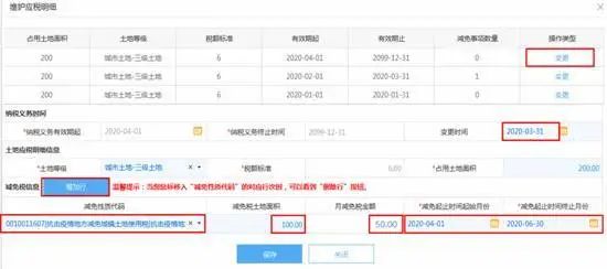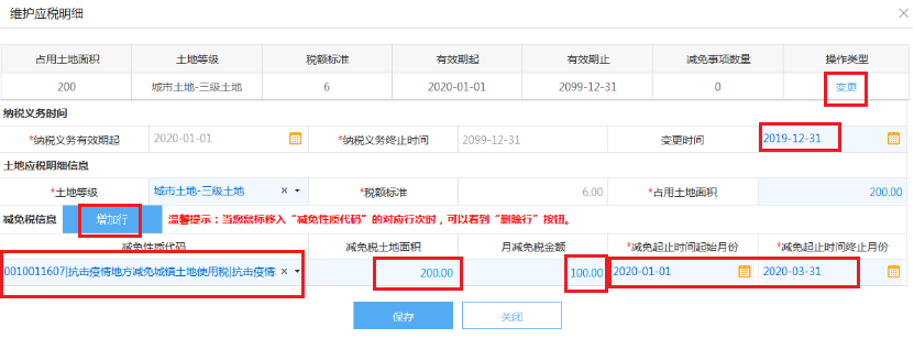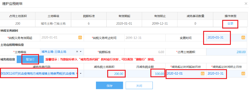 先点击应税明细条目后“变更”,点击“减免税信息”中的“增加行”,选择对应减免性质“抗击疫情地方减免城镇土地使用税”,填写减免税土地面积200,月减免税金额100,减免起止月份为2-3月。然后,填写“变更时间”,为“减免起止时间起始月份”前一个月月末最后一日即2020年1月31日。(即减免月份2-3月,减免税额共200元,月减免税额100元)。