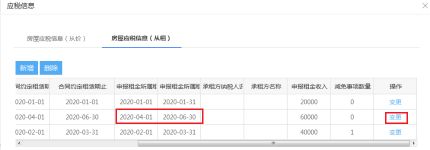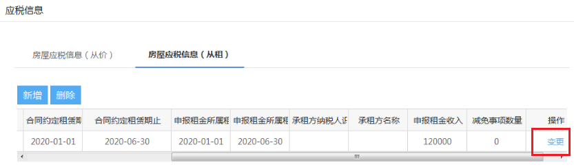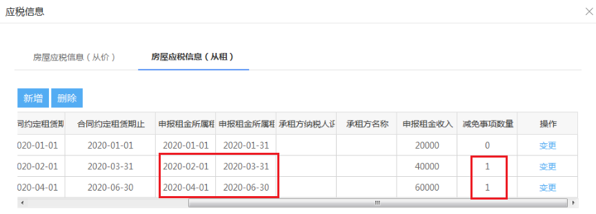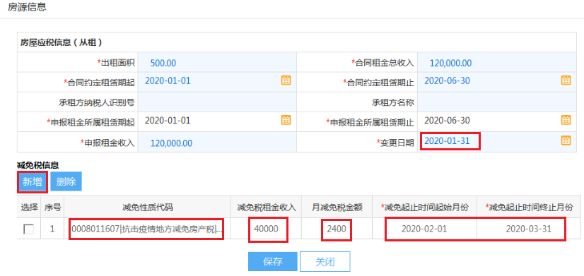 先选择房屋应税信息(从租),点击应税明细条目后“变更”,点击“减免税信息”中的“新增”,选择对应减免性质“抗击疫情地方减免房产税”,填写减免税租金收入20000*2=40000,月减免税金额2400,减免起止月份为2~3月。然后,填写“变更时间”,为“减免起止时间起始月份”前一个月月末最后一日即2020年1月31日。(即减免月份2~3月,减免税额共4800元,月减免税额2400元。