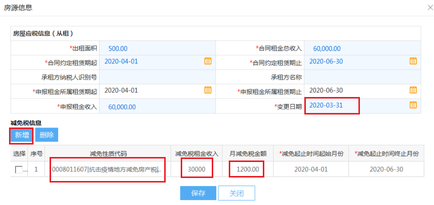 先点击4~6月所对应的应税明细条目后“变更”,点击“减免税信息”中的“新增”,选择对应减免性质“抗击疫情地方减免房产税”,填写减免税租金收入20000×50%×3=30000,月减免税金额1200,减免起止月份为4-6月。然后,填写“变更时间”,为“减免起止时间起始月份”前一个月月末最后一日即2020年3月31日。(即减免月份4~6月,减免税额共3600元,月减免税额1200元)