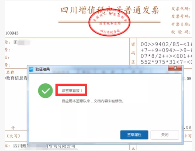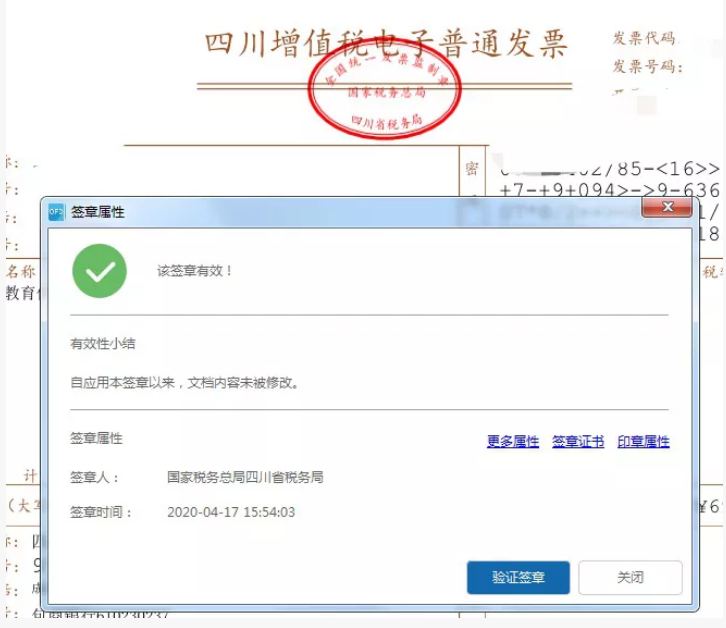 当您使用OFD阅读器打开该发票时,鼠标移至税务机关监制章处,点击鼠标右键,出现验证、属性选项,选择验证有如下提示(如下图)。
