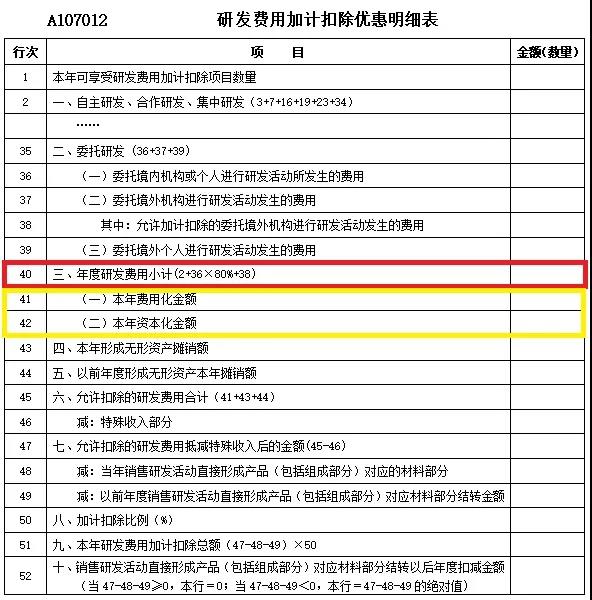 最后,A107012将自主研发、集中研发、合作研发和委托外部研发的80%加上符合条件的委托境外研发,这三部分数据加总作为年度研发费用小计(2+36×80%+38)。