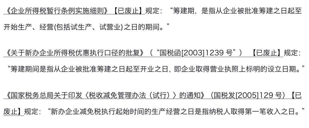 税法上,“开始生产经营”、“营业执照标明的设立日期”、“取得第一笔收入”均曾作为界定筹建期的标准,但上述有关筹建期认定的条文均已废止或失效,目前税法上未有对筹建期的明确界定。我们可以参考一些地方税局的执行口径,如厦门市地方税务局12366咨询中心关于筹建期定义为“筹建期指从企业被批准筹建之日起至开始生产、经营(包括试生产、试营业)之日的期间。开始生产经营之日是指纳税人取得第一笔收入之日”。